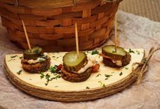 60/150/30/5 г • «Халявки» – бутерброды с салом и соленым огурцом;- Руляды из птицы 2-х видов: с морковью и с черносливом;- Колбаса по-домашнему жареная из свинины;- Домашние солёные огурцы и помидоры, морковь пряная, перец маринованный, капуста красная квашеная, хрен,