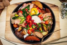 180/100/200/50/30/3 г • Жареные картофель и яичница, копчёная грудинка, лук, грибы, домашняя свиная колбаса / Sizzling country style frying pan with fried egg, potatoes, smoked bacon, leeks, mushrooms, home-made pork sausage