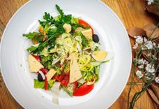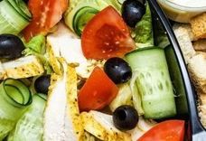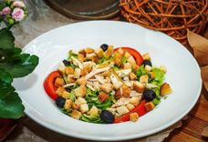 310/3 г • лёгкий салат из филе птицы со свежим огурцом, помидором, зеленью–подаётся с сухариками и сырно-чесночной заправкой / light salad of chicken fillet and fresh vegetable with croutons and cheese & garlic dressing