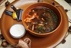 300/60/50/25/20/3 г • Сложный букет вкуса оценят знатоки: остро-кисло-солоноватый суп с нашей фирменной бужениной, копченой грудинкой, говядиной, а также с солёными огурцами, маринованными каперсами, и лимоном / Traditional Slavonic soup of pickled / salted vegetables and 3 different kinds of meat – home-made baked pork, bacon and beef