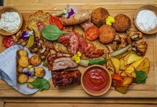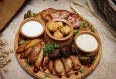 1540 г • Сет на 3-5 чел, в составе сета: драники,пельмени, митболлы из баранины, ребра запеченные, картофель отварной во фритюре, колбаса домашняя, куриные крылышки, чипсы из грудинки, овощи, сметана, кетчеуп, соус тар-тар.