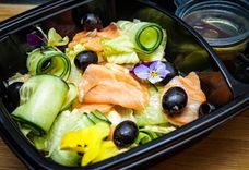 320/3 г • Изысканный диетический салат из филе сёмги и свежих овощей: сладкий перец, помидоры, лук, маслины, лимон, оливковое масло, сыр, яйцо, соевый соус / Salmon fillet, paprika, tomatoes, leeks, lemon, olive oil, black olives, cheese, egg, soy sauce