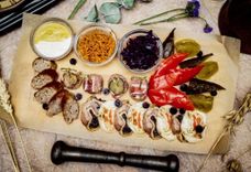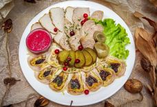 200/30/30/30/20/5/3 г • Домашняя буженина, руляды из птицы с морковью и с черносливом, домашняя колбаса, консервированные помидоры, cолeные огурцы / Cold baked pork, rolls of poultry with prunes and with carrot, home-made sausage, pickled tomatoes & cucumbers