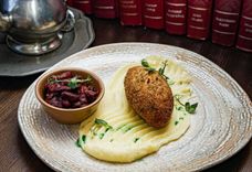 Котлета по-киевски – из куриного филе, фаршированная маслом. Подаётся с картофельным пюре и томлёной фасолью.