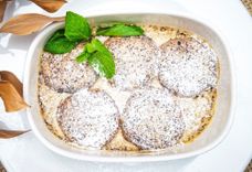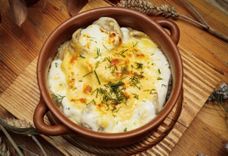 Домашние колдуны со свининой, запеченные со сметаной и сыром / Home-style pork-filled dumplings baked with sour cream, cheese and pork