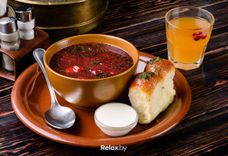 250/40/30/50 г • Вариант приготовления борща с фасолью и говядиной, пампушки с чесночной поливкой и сметаной.