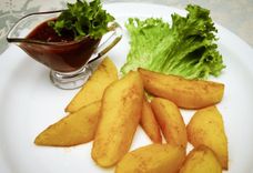 170/200/30/6 г • Карп – жареный до хрустящей корочки, картофель отварной обжаренный во фритюре, кетчуп, зелень, специи, лимонный сок, фирменное масло / Fried carp, boiled potatoes fried, ketchup, greens, spices, lemon juice, butter.
