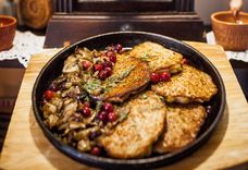 160/200/130/30/100/5 г • Драники по-домашнему и грудинка жареная;- Жареные колбасы: «по-домашнему» из свинины и «потрошанка» из говяжьей печени и гречневой крупы;- «Калдуны» мясные (пельмени) cо свининой - жареные и запеченные; - Картофель по деревенски дольками и бульбяники –