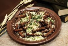 200/50/3 г • Тонкие блинчики с начинкой из курицы и жареного лука и грибов, и сливочного соуса, запечённые в форме «пастушьих сумок» / Delicate home-made crepes filled with сhicken, fried onions and cream & mushroom sauce, baked