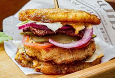Дранбургер с куриной котлетой и жаренным беконом. Соус для дранбургера, салат, помидор, лук маринованый, огурец маринованый.