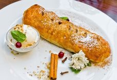 Штрудель из тонкого слоёного теста с яблоками, грецким орехом и цедрой лимона.