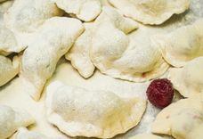 Вареники с творогом, сметаной и клубничным соусом / Vareniki with cottage cheese, sour cream and strawberry sauce